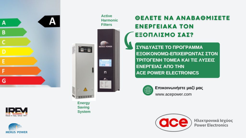 Στα πλαίσια του προγράμματος «ΕΞΟΙΚΟΝΟΜΩ-ΕΠΙΧΕΙΡΩΝΤΑΣ», η ACE Power Electronics προτείνει λύσεις ενέργειας για την ενεργειακή αναβάθμιση κάθε εγκατάστασης. Οι βελτιστοποιητές τάσης και τα Ενεργά Φίλτρα Αρμονικών αποτελούν τις πιο κατάλληλες επιλογές για την βελτίωση της απόδοσης της επιχείρησης. Συγκεκριμένα, οι βελτιστοποιητές τάσης Ecostab-Ecobuck που κατασκευάζονται από την ιταλική εταιρία ΙREM, με εύρος ισχύος 5 έως 4000 KVA (μονοφασική & τριφασική έκδοση) βελτιστοποιούν και σταθεροποιούν την τάση λειτουργίας στον εξοπλισμό και ταυτόχρονα αυξάνουν το επίπεδο της ποιότητας της ηλεκτρικής ενέργειας.