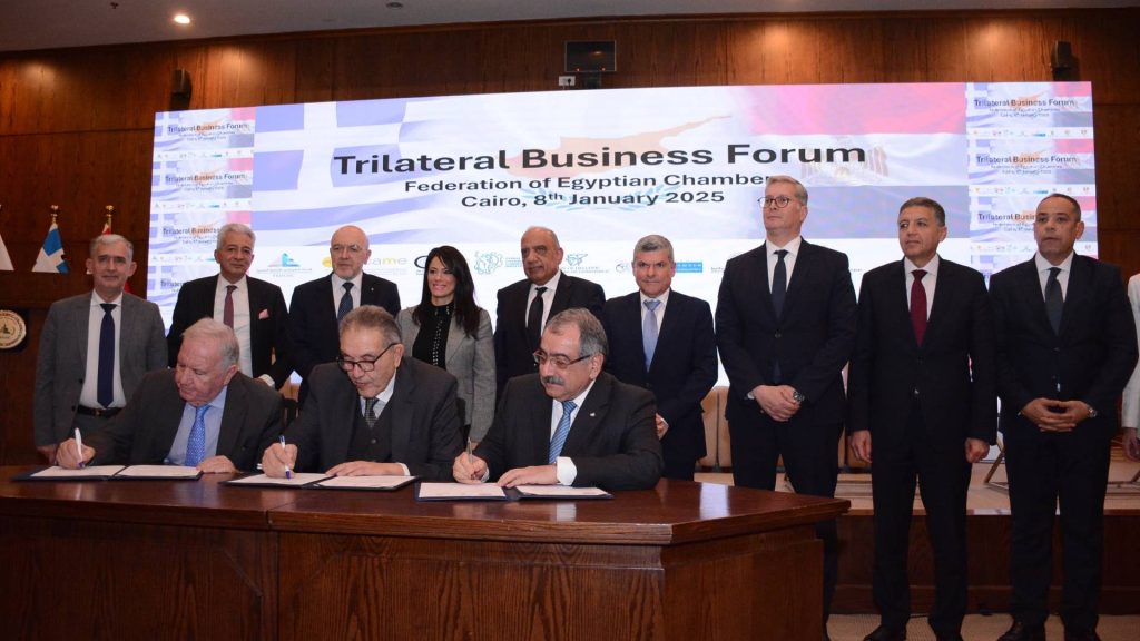 Μνημόνιο συνεργασίας υπέγραψε η Κεντρική Ένωση Επιμελητηρίων Ελλάδος με την Ομοσπονδία Αιγυπτιακών Εμπορικών Επιμελητηρίων και το Κυπριακό Εμπορικό και Βιομηχανικό Επιμελητήριο, στο περιθώριο της συνάντησης κορυφής των τριών κρατών που πραγματοποιήθηκε στο Κάιρο. Ελλάδα, Αίγυπτος και Κύπρος κοιτούν προς το επιχειρηματικό μέλλον δυναμικά και διαμορφώνουν τις κατάλληλες συνθήκες για την περαιτέρω σύσφιγξη των σχέσεων των τριών χωρών, με σκοπό την προώθηση νέων τεχνικών και οικονομικών συνεργασιών.