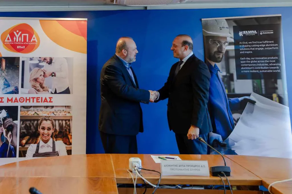 Μνημόνιο συνεργασίας για την ενίσχυση της επαγγελματικής εκπαίδευσης και της απασχόλησης υπέγραψαν σήμερα, στα γραφεία της Δημόσιας Υπηρεσίας Απασχόλησης στον Άλιμο, ο Διοικητής της ΔΥΠΑ, Σπύρος Πρωτοψάλτης, και ο Διευθυντής Ανθρώπινου Δυναμικού της Elval – τομέα έλασης αλουμινίου της ElvalHalcor – Γιώργος Παπανδρέου, με στόχο τη στενότερη διασύνδεση της τεχνικής εκπαίδευσης με τις πραγματικές ανάγκες της σύγχρονης βιομηχανίας.