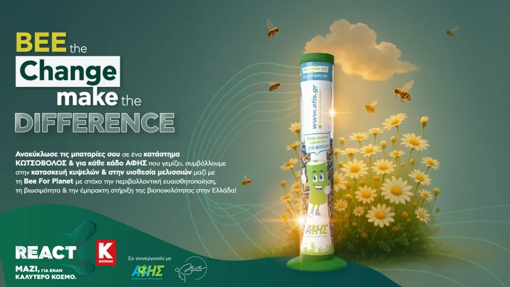 Με βασικό μήνυμα «Bee the Change – Make the Difference» και με αφορμή τη φετινή Παγκόσμια Ημέρα Περιβάλλοντος, οι δύο εταιρείες καλούν το κοινό να ανακυκλώσει από τις 5 Ιουνίου 2025 τις μπαταρίες του στους ειδικούς κάδους ΑΦΗΣ που είναι τοποθετημένοι σε 59 καταστήματα Κωτσόβολος σε όλη την Ελλάδα. Για κάθε κάδο ΑΦΗΣ που γεμίζει, η Κωτσόβολος και η ΑΦΗΣ συμβάλλουν στην κατασκευή κυψελών και στην υιοθεσία μελισσιών. Με αυτόν τον τρόπο, το κοινό κάνει REACT για έναν Καλύτερο Κόσμο και γίνεται μέρος της αλλαγής, αφού ακόμη και μια μικρή κίνηση – όπως η ανακύκλωση μιας μπαταρίας – μπορεί να δημιουργήσει ένα κύμα θετικής αλλαγής, όπως και το φαινόμενο της πεταλούδας.