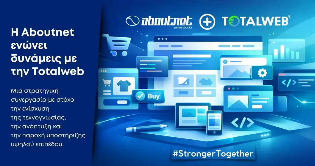 Η Aboutnet, μία από τις παλαιότερες και μεγαλύτερες εταιρίες παροχής digital υπηρεσιών στην Ελλάδα, ανακοινώνει την απορρόφηση μέρους του πελατολογίου καθώς και στελεχών της digital agency TotalWeb, η οποία δραστηριοποιείται στον χώρο εδώ και περισσότερα από 20 χρόνια.