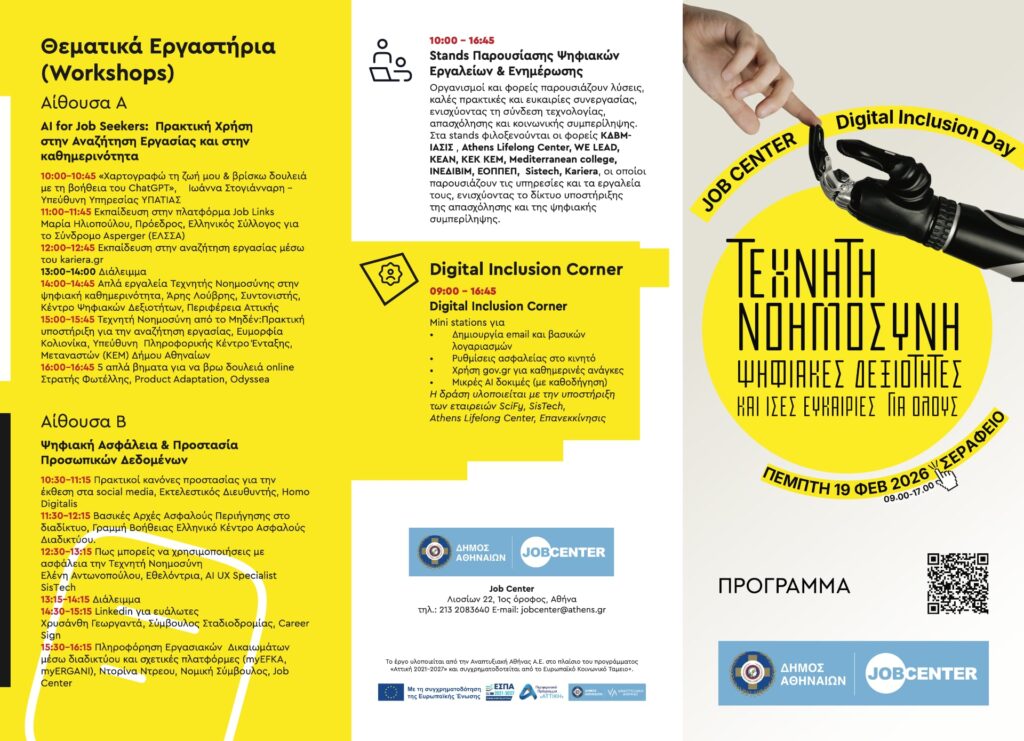 Το Job Center Δήμου Αθηναίων διοργανώνει την Πέμπτη 19 Φεβρουαρίου 2026, ώρες 9:00-17:00, το Digital Inclusion Day 2026, μια ολοήμερη ημερίδα αφιερωμένη στην ψηφιακή συμπερίληψη, την υπεύθυνη αξιοποίηση της Τεχνητής Νοημοσύνης (AI) και την ισότιμη πρόσβαση όλων στην αγορά εργασίας.